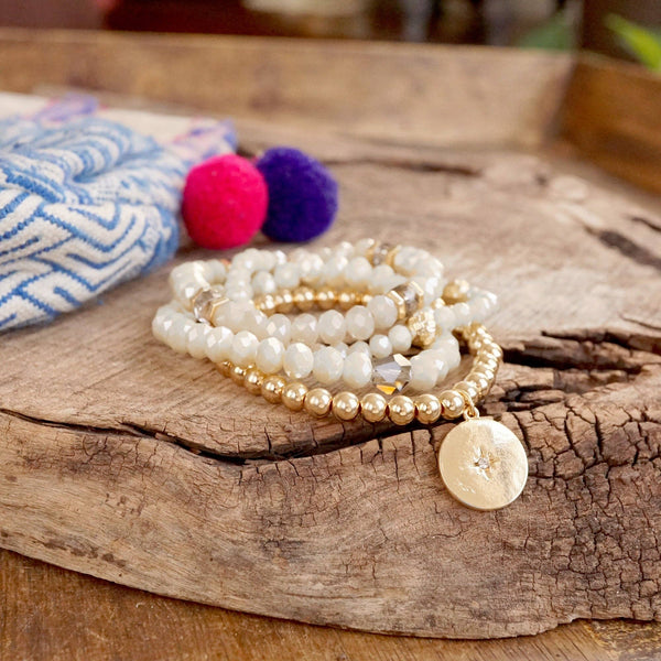 Beaded Bracelets set Gold Coin Sparkly Ivory Off White Glass Metal beads